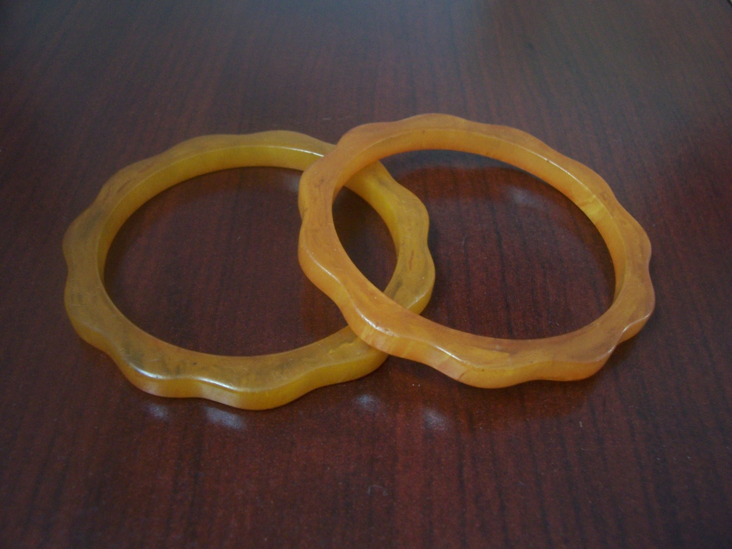 Anyway, I stopped in to this thrift store with my kids. They were both kind of cranky, and I didn't really have much time to look at anything else, but I always make time to look through the jewelry. To my surprise I found three bakelite bracelets in the $1 basket. One was a simple ivory colored adult size bangle, and the other two were child-size applejuice (because of their transparency and color) bakelite bracelets.